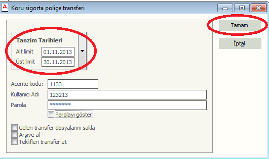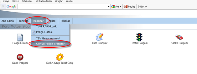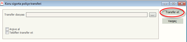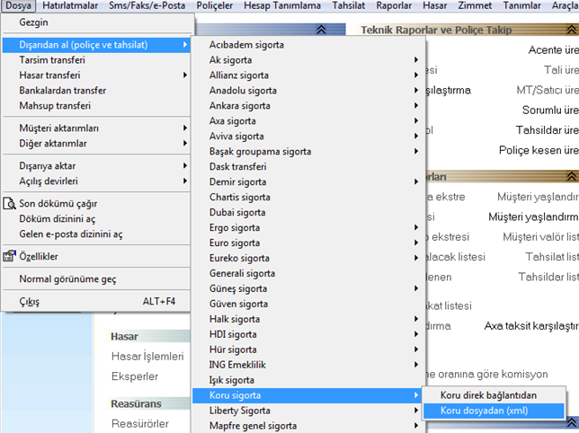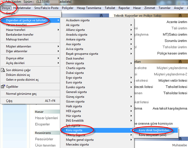 Koru sigorta şirketinden transfer alma işlemi Ada programından Dosya/Dışarıdan al/Koru Sigorta/Koru direk bağlantıdan kısmından alabilirsiniz. Daha sonra çıkan ekrandan Tarih verip tamam butonuna basmanız transfer işlemini gerçekleştirecektir. Koru sigorta transferinde direk bağlantıdan yerine xml olarak almak isterseniz yapılacak işlemler değişir. Koru sigorta şirket ekranında Raporlar/Geriye Poliçe Transferi sekmesinden alabilirsiniz. Çıkan diğer ekranda tarih aralığı kısmına transfer etmek istediğiniz tarihi girip, Arka planda Başlat dediğinizde xml transfer dosyası size mail olarak gelecektir. Gelen transfer dosyasının kayıt işleminden sonra Ada programında Dosya/Dışarıdan al/Koru/Koru xml dosyadan takip edilerek alınır.