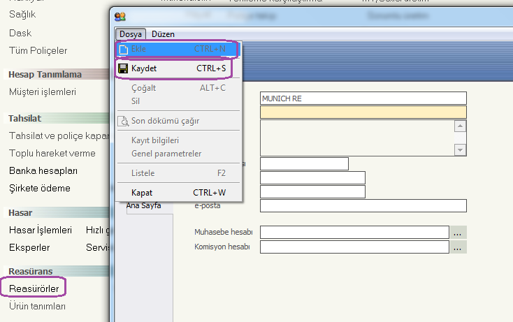 Sisteme reasürör tanımı yapabilmek için Reasürörler linkine tıklayın.