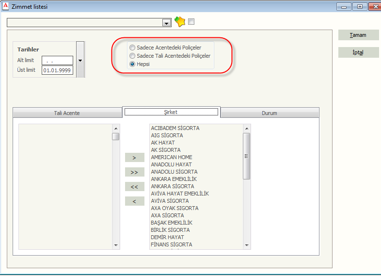Bu liste ile zimmetlenmiş poliçeler görülebilir. Liste için zimmet / zimmet listesine gelinir. İstenilen kriterler seçildikten sonra tamam'a basılır. ( Bkz. Şekil 3)