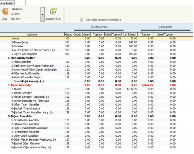 İstenen aya ait bilanço dökümü dönem karşılaştırmalı olarak alınır. Bkz.Şekil2 ve şekil3