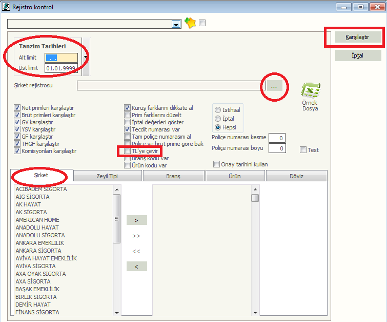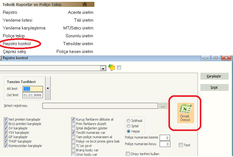 Şirketten dosya alınıp programdaki dosya içeriğine benzetildikten sonra programdaki Rejistro kontrol ekranına gelinir ve ilgili şirket sağ kısma atılır.Şirketten alınan üretim tarihi program tanzim tarihi kısmına girilir ve isteğe bağlı olarak branş,ürün, döviz tipi ayırımı da yapılabilir.Şirket üretim dosyası eğer TL olarak alınmış ise TL'ye çevir seçimi yapılıp; şirket rejistrosu satırının sonundaki (...) kısmından şirket dosyası seçilir ve karşılaştır butonuna basılır.(Bkz Şekil 10)