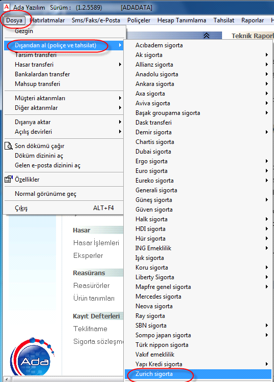 Almış olduğunuz XML dosyasını Ada Yazılıma aktarmak için Dosya > Dışarıdan Al >Zurich Sigorta demeli ve indirmiş olduğunuz transfer dosyasını seçmelisiniz. Transfer et demelisiniz.