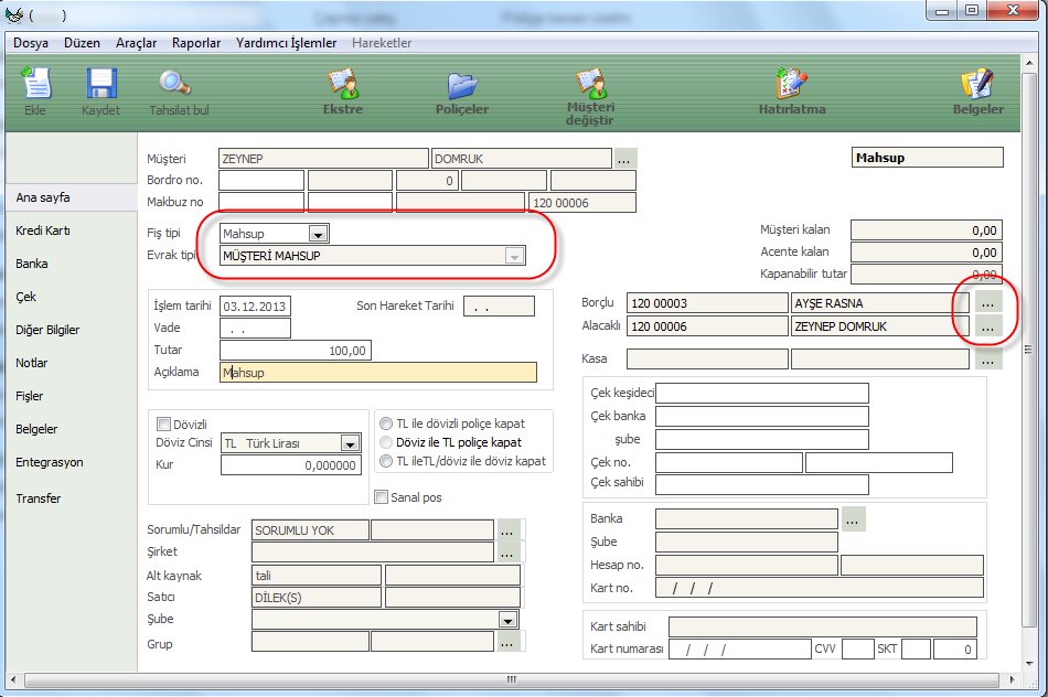 Müşteri kısmına borcu olan kişi seçilir, evrak tipi mahsup seçilir ve tutar girilir. Borçlu olan hesap alacağı olan kişi seçilir, alacaklı hesap borcu olan kişi seçilir ve ctrl+S ile kaydedilir. (Bkz. Şekil 26)
