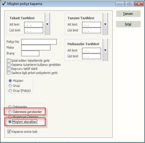 Tahsilat ve poliçe kapama ekranına gelinir.
