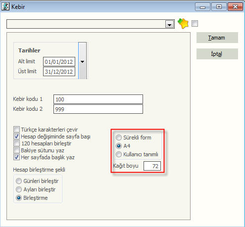 Tarih aralığı verilir. Kağıt tipi ve diğer tercihler belirlendikten sonra Tamam butonu kullanılır. Bkz. Şekil2