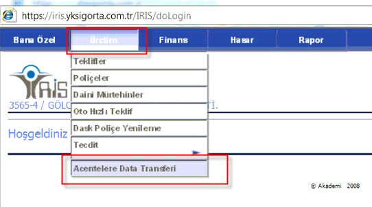 YAPIKREDİ SİGORTA POLİÇE TRANSFERİ İris ekranından Xml dosyası alınarak poliçe transferi yapılmaktadır. Alttaki gibi sisteme giriş yapılır.