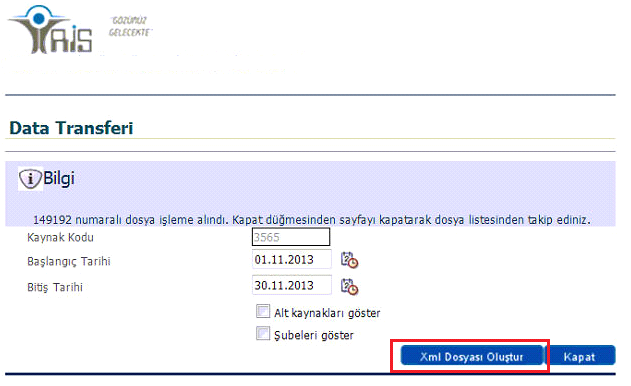 Alttaki ekrandaki gibi Başlangıç ve Bitiş tarihi girilir. Xml dosyası oluştur butonuna tıklanır.