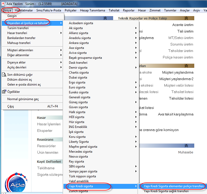 Almış olduğunuz XML dosyasını Ada Yazılıma aktarmak için Dosya > Dışarıdan Al >Yapıkredi Sigorta > Yapıkredi Elementer Poliçe Transferi demeli ve indirmiş olduğunuz transfer dosyasını seçmelisiniz. Transfer et demelisiniz.
