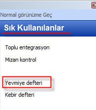 Kapanan dönem için yevmiye defterinizi yazdırabilirsiniz. Döküm almak için muhasebe modülünde sol frame üzerinde yer alan sık kullanılanlar sayfası altından Yevmiye defteri seçimine gelmelisiniz.Bkz.Şekil1