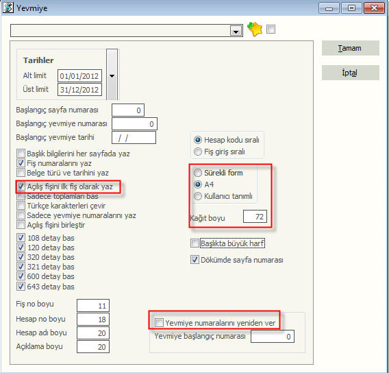 | • | Döküm ile ilgili gerekli seçimler yapılır(açılış fişinin ilk fiş olarak yazılması, başlık bilgilerini her sayfada yazılması gibi). Dökümün yaplacağı kağıt tipi seçilir. |