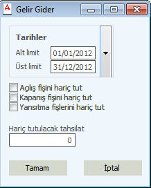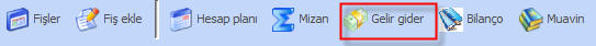 Gelir Gider dökümü alabilmek için muhasebe modülü altında araç çubuğundan Gelir gider butonunu kullanmalısınız. Bkz.Şekil1