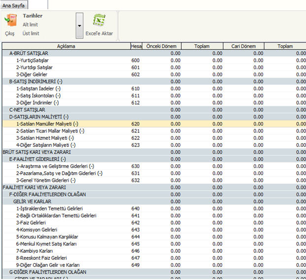 İstenen aya ait gelir gider tablosu dönem karşılaştırmalı olarak alınır. Bkz.Şekil2 ve şekil3