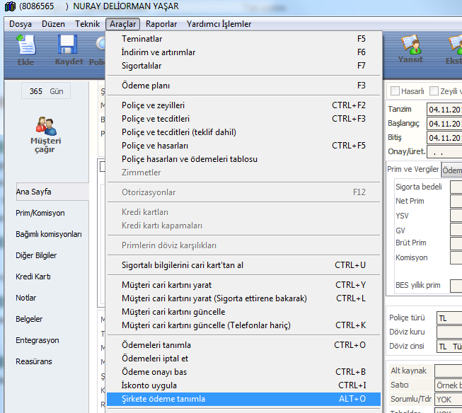 Poliçe üzerinden kendi acente kartınız ile şirkete ödeme kapatabilmek için önce poliçeyi ekrana çağırınız. Araçlar / Şirkete Ödeme Tanımla menusunu ya da kısayol Alt+O tuş kombinasyonunu kullanabilirsiniz.