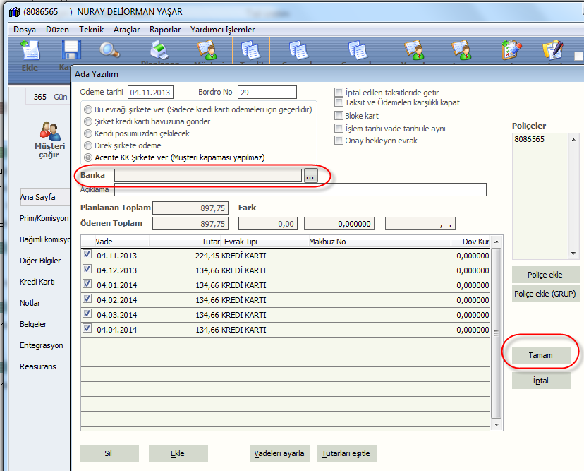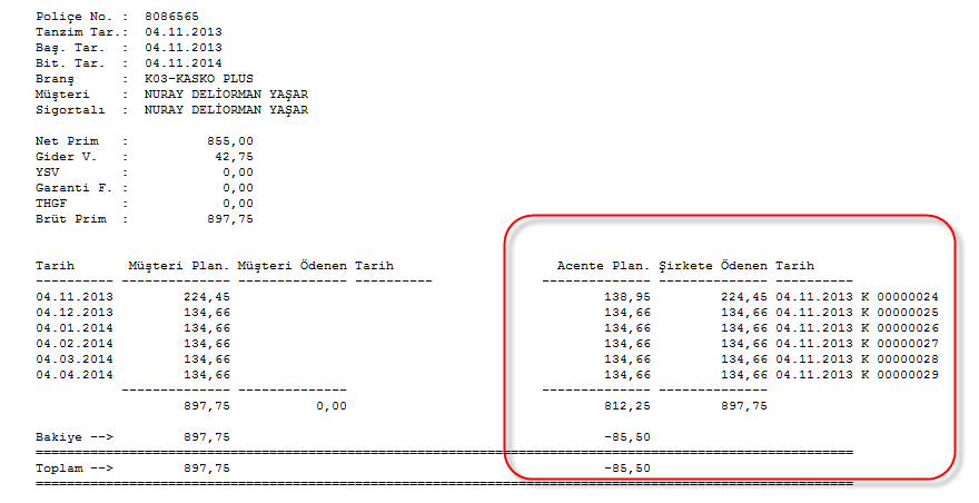 Tamam a bastıktan sonra gelen planlanan/ödenen raporunda durum asagıdaki gibi olacaktır. Kendi kartınız ile sigorta şirketine ödeme yaptıgınız için sol taraf yani musteri tarafı açık görünecektir. Sadece sağ taraf yani şirket tarafı kapanır.