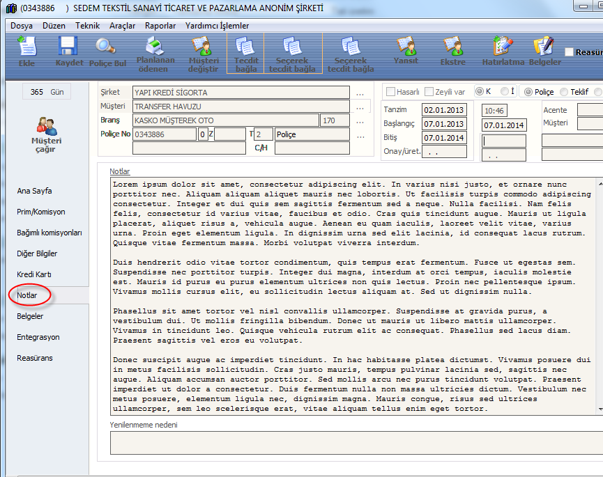 Poliçe uzerine not bilgisi eklemek için Tum poliçeler ekranından poliçenizi bulup CTRL+D ile duzeltme moduna geçin. Daha sonra Notlar sekmesinden asagıdaki gibi girişinizi yapıp Kaydet butonu ile saklayabilirsiniz.