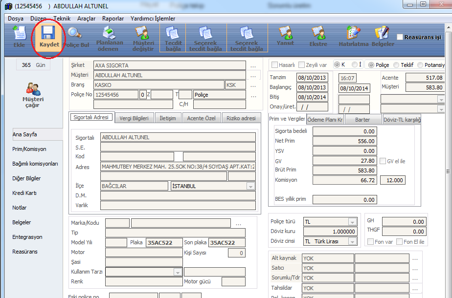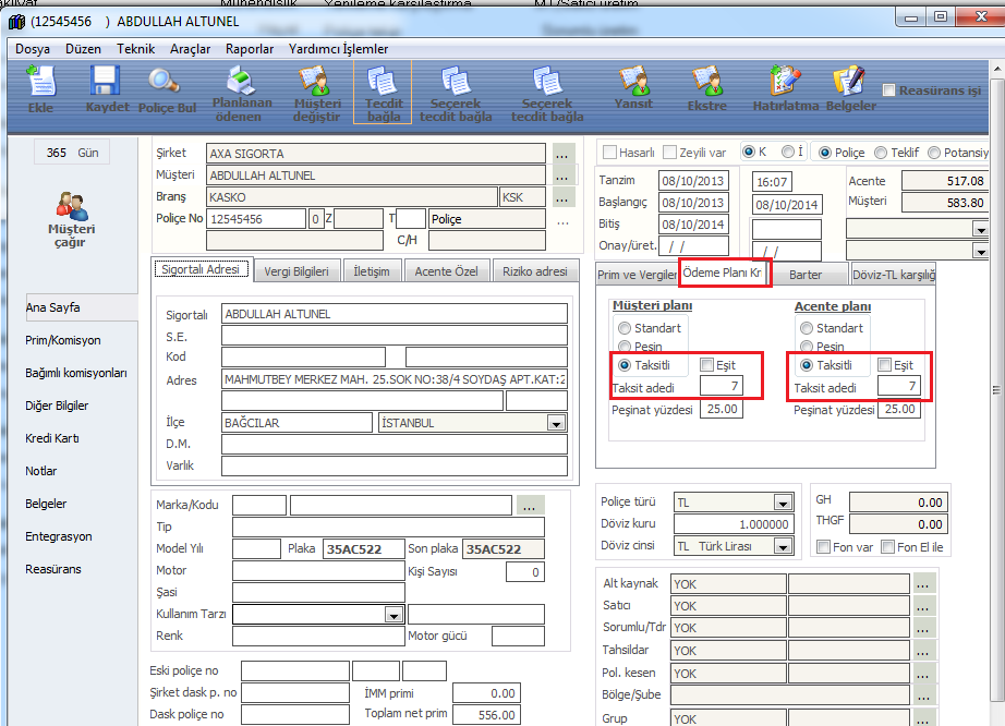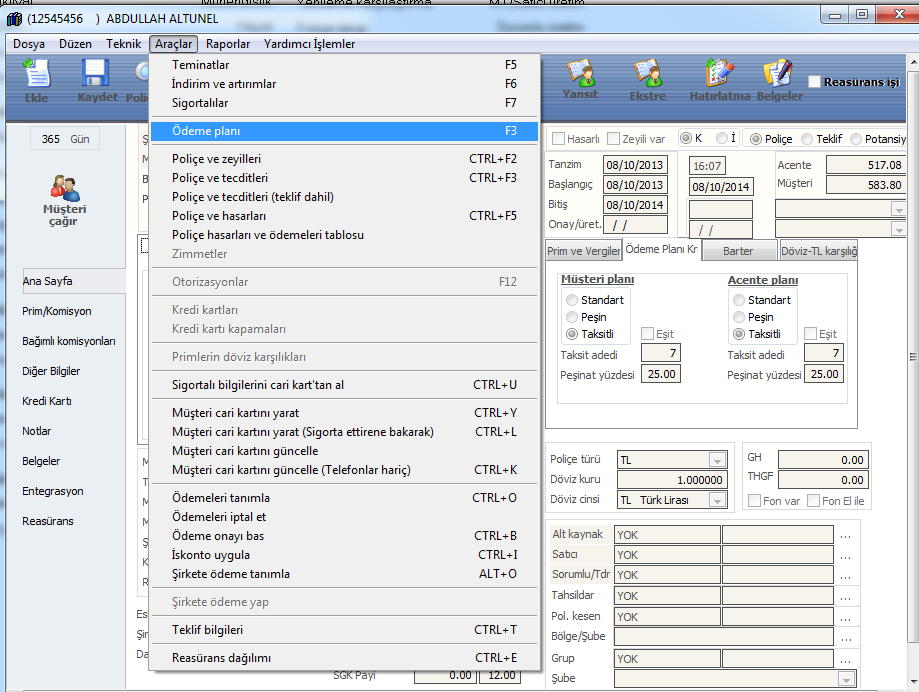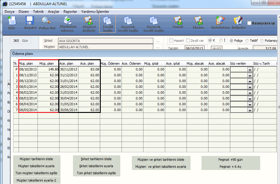 Taksit sayısını ayarladıktan sonra vadeleri ve taksit tutarlarını değiştirmek istiyorsanız, poliçe uzerinden Araçlar / Ödeme Planı menusunu kullanabilirsiniz.