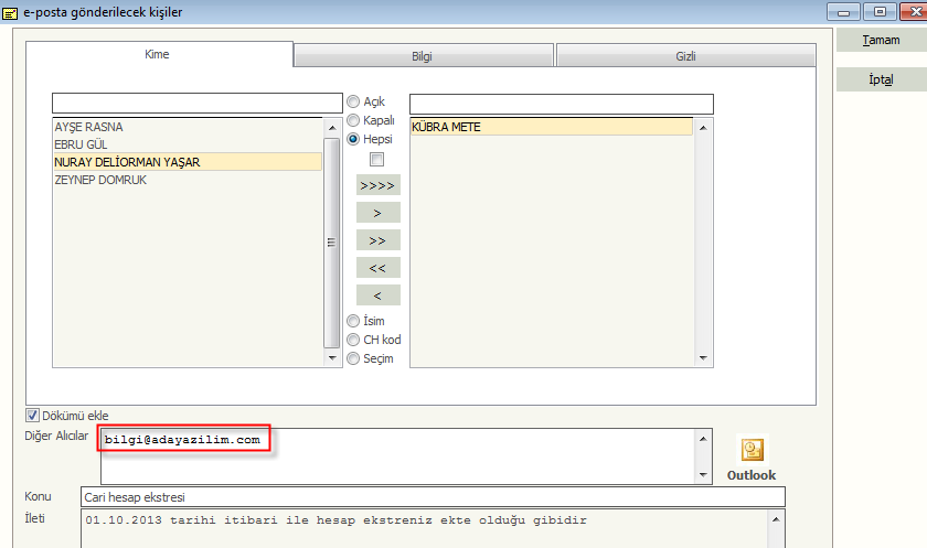 E-posta sunucunuz ve e-posta hesabınız programda tanımlı ise müşterilerinize kendi hesap ekstrelerini, rejistro dökümlerini mail ile yönlendirebilirsiniz. Müşterilerinize e-posta yönlendirmesi yapabilmeniz için cari kartlarında e-posta adreslerinin kayıtlı olması gerekmektedir.