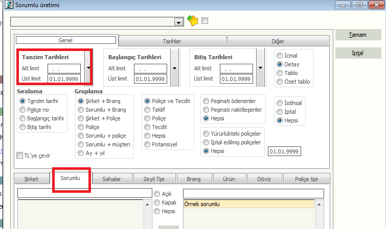 Sorumlu Üretim listesinden sorumlunun toplam aylık üretimini,hakkettiği komisyonu,sorumluya ödenen komisyonu ve kalan komisyon bakiyesinin seçim kriterleriniz doğrultusunda alabildiğiniz rapordur.