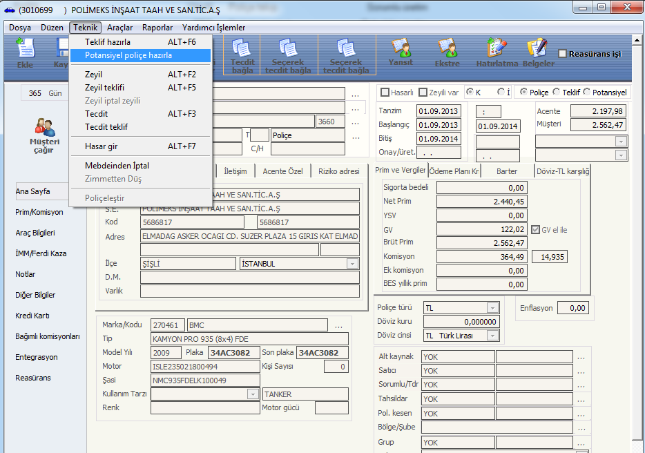 Asagıda potansiyel poliçe giriş ekranını görmektesiniz.