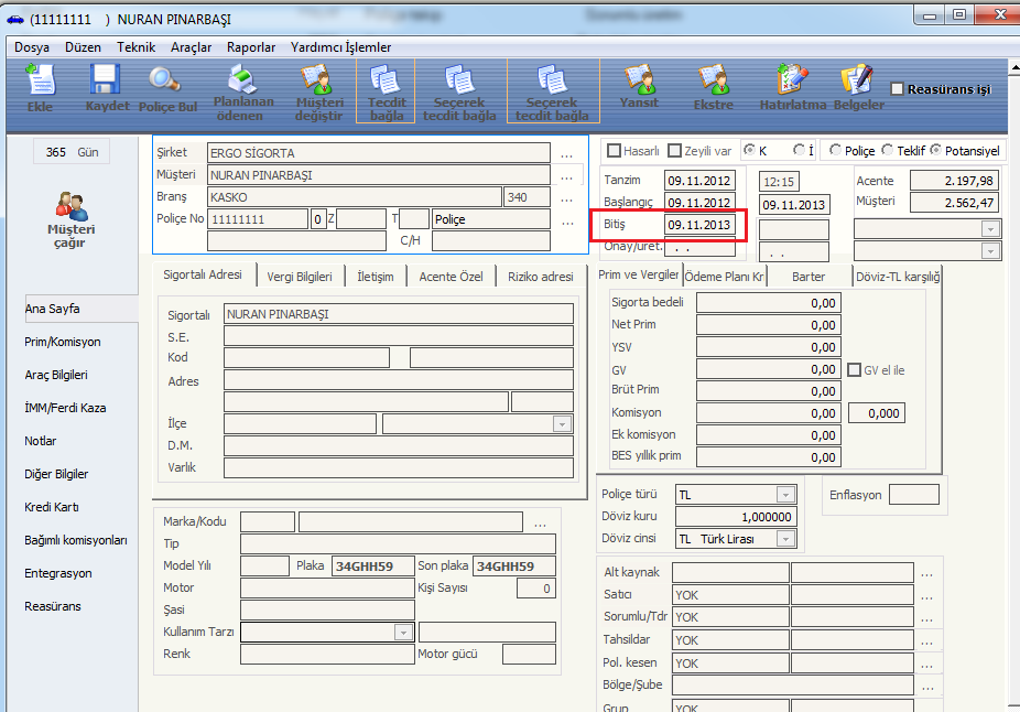 Potansiyel poliçe girişlerinde özellikle bitiş tarihini dogru yazmalısınız. Zira sistem bu bitiş tarihine göre yenileme dönemi geldiginde size uyarı verecektir.