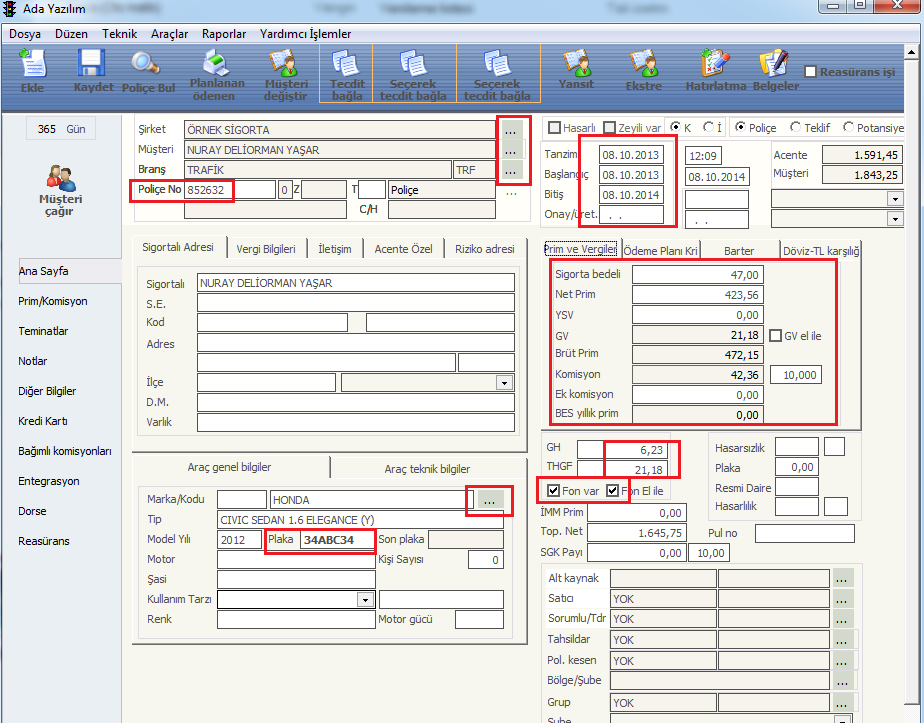 Özellikle trafik poliçelerinde net primi yazdıktan sonra, brüt primi tutturabilmek için vergi ve diger fonları da elinizde bulunan poliçe kagıdındaki bilgilere göre dogru bir biçimde girmeniz gerekir. Bunun için fon var ve fon el ile kutucukları işaretlenir, kaydedilir, CTRL+D ile duzeltme moduna geçildikten sonra ilgili yerler doldurulur. En son Kaydet butonuna bastıgınız anda brut prim hesaplanır ve ait oldugu alana yansır.