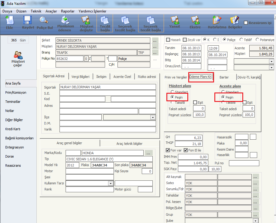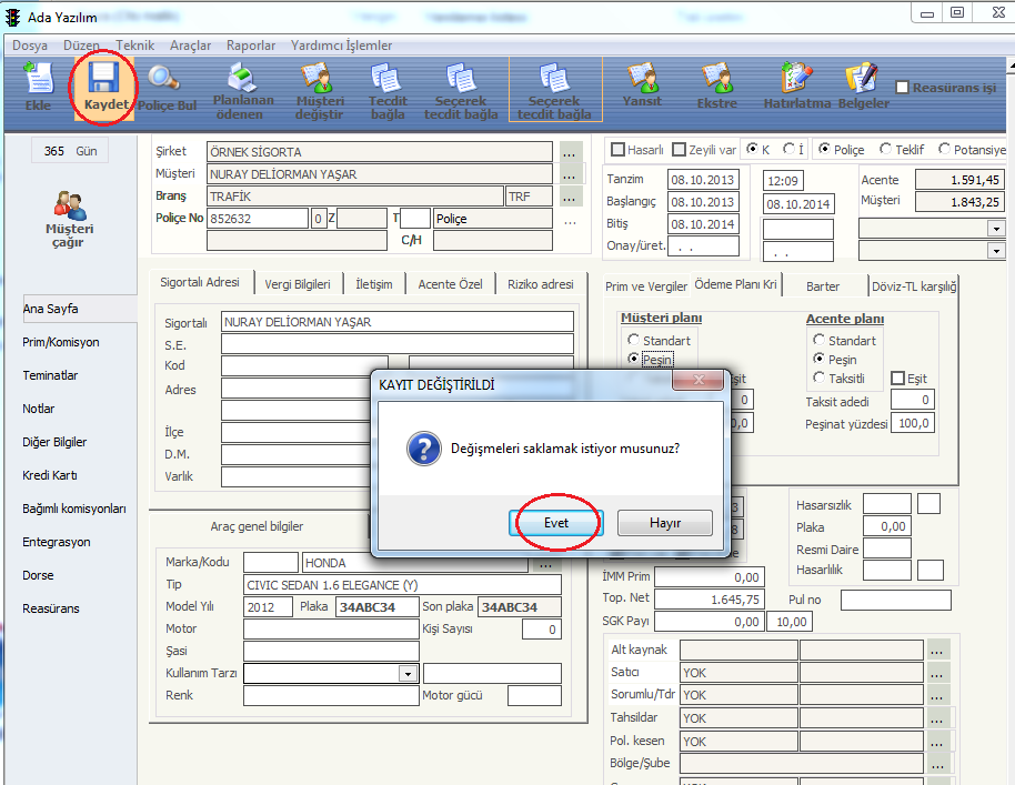 Asagıda elle girilen örnek bir trafik poliçesi görmektesiniz.