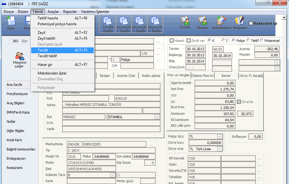 Yenilemesi yapılan poliçelerin manuel girişini yapabilmek için öncelikle kendi branşından girmeniz gerekiyor. Örneğin, Kasko branşına ait bir yenileme girilecek ise, Kaza (Oto Kasko) linkinden girip poliçe bul deyin ve öncelikle eski poliçesini bulup ekrana çagırın. Sonrasında Teknik / Tecdit secenegini kullanın.
