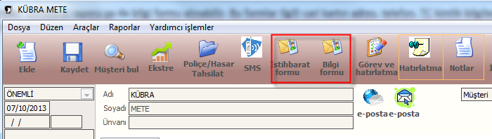 Müşteri cari kartı üzerinden istihbarat raporu ya da bilgi formu alınabilir. Bu formlar ilgili cari kartın adres, telefon, TC kimlik bilgileri, mesleği, referans kişi adı gibi bilgileri bulundurmaktadır. İlgili cari kartı ekrana getirdikten sonra araç çubuğundan istihbarat formu ya da bilgi formu yazdırabilirsiniz.Bkz.Şekil29