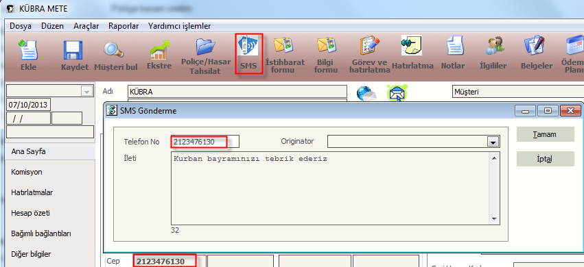 Müşterilerinize SMS gönderimi yapabilirsiniz. SMS gönderimi yapabilmeniz için çalıştığınız SMS firmasına ait kullanıcı adı ve şifre gibi bilgileri programa kaydetmelisiniz. Mesaj gönderimi yapmak istediğiniz cari kartta müşteri cep telefonunun yazılmış olması gerekmektedir. Bkz.Şekil19